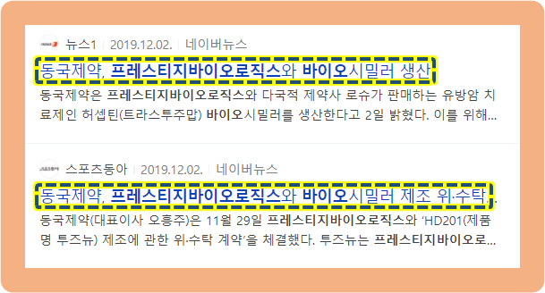 2019년 12월, 프레스티지바이오로직스와 동국제약이 HD201(투즈뉴) 제조에 관하여 위수탁 계약을 체결한 것인데요.