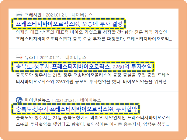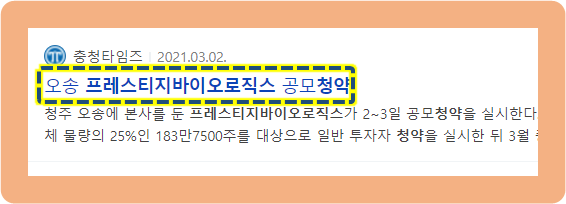 상장 하기 전인 2021년 1월 21일, 오송바이오폴리스에 공장 증설을 추진 중인 프레스티지바이오로직스와 충청북도, 청주시가 약 2260억원 규모의 투자협약을 맺었습니다.