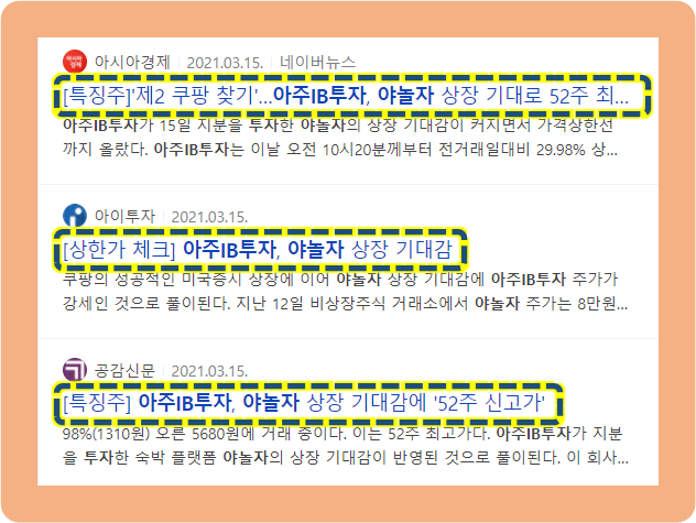 2021년 3월 15일, 아주IB투자가 지분을 투자한 기업인 야놀자의 상장 기대감이 증가하면서 상한가를 기록했는데요.