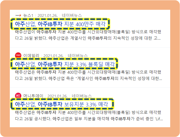 2021년 1월 26일에는 아주산업이 아주IB투자의 지분 400만주를 블록딜 방식으로 매각했다는 소식이 발표되었습니다.