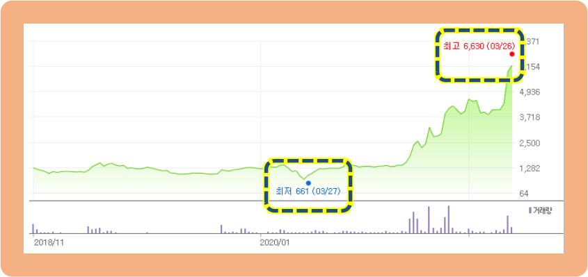 10년 간 최저점은 2020년 3월 기록한 661원이구요. 최고점은 1년 뒤인 2021년 3월에 기록한 6,630원입니다. 1년 동안 무려 10배나 증가한 급등 종목이네요.