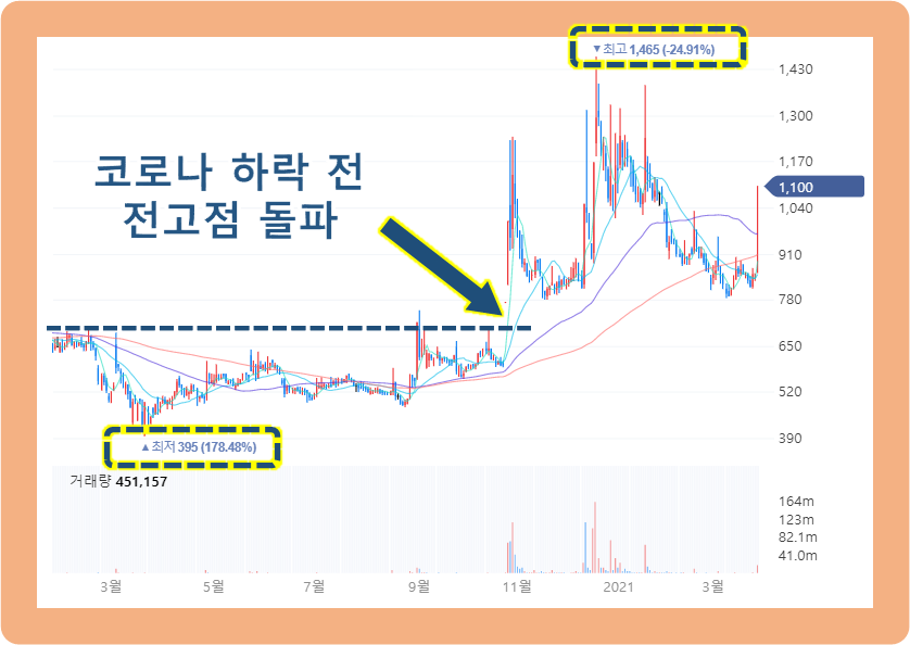 2020년 3월, 코로나 하락사태 때 주가는 최저 395원까지 하락했었습니다. 이후 코로나 이전의 주가를 회복하지 못하고 있었는데요.