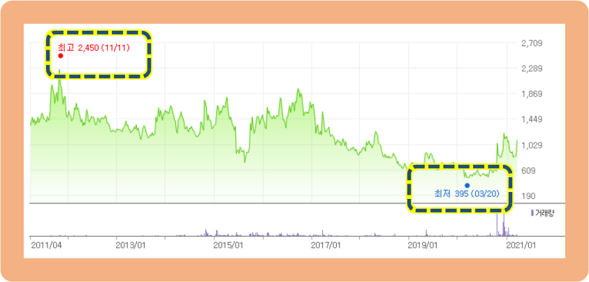 10년 간 최고점은 2011년 11월 기록한 2,450원이고 최저점은 2020년 3월 기록한 395원입니다.