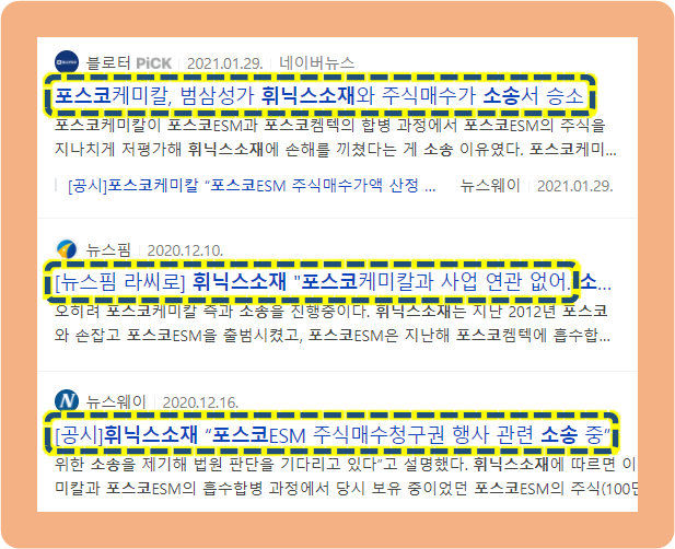 휘닉스소재가 2019년도 5월에 대구지방법원 포항지원에 주식매수가액 결정 소송을 제기했었습니다. 포스코케미칼이 포스코ESM과 포스코켐텍의 합병 과정에서 포스코ESM의 주식을 저평가했기 때문에 휘닉스소재에 손해를 입혔다는 내용이 소송 이유였구요.