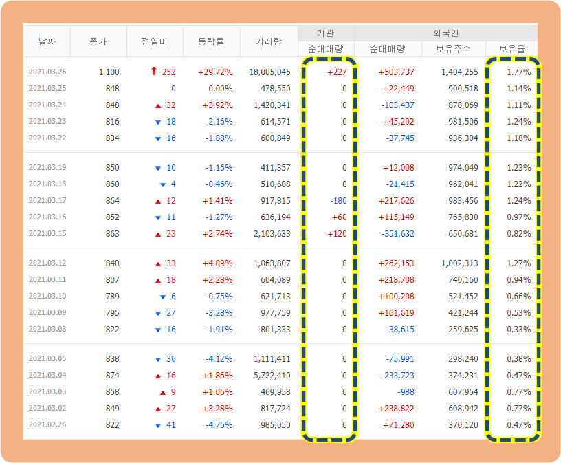 기관투자자의 경우, 거래량이 거의 없는 수준인데요. 매수세가 매도세보다 약간 우위에 있는 상황입니다.