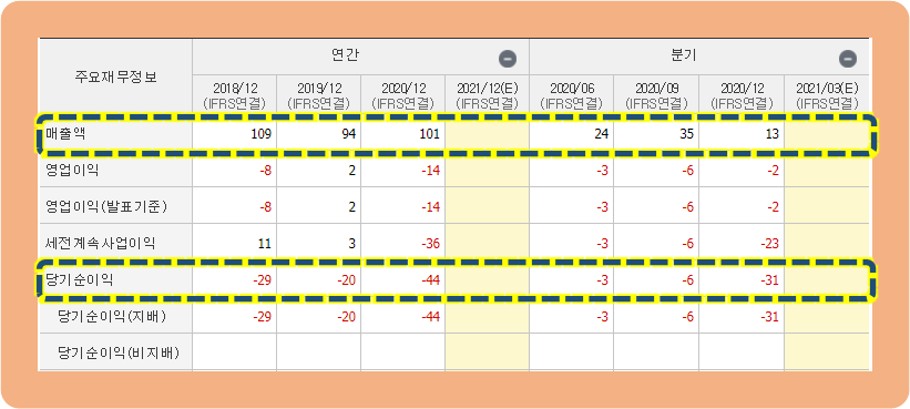 그리고 연간 당기순이익은 2018년도 이후 연속으로 적자를 기록하고 있네요. 2020년도 기준으로 -44억원 순손실을 기록하면서 전년도 대비 적자 폭이 더 커진 상황입니다.