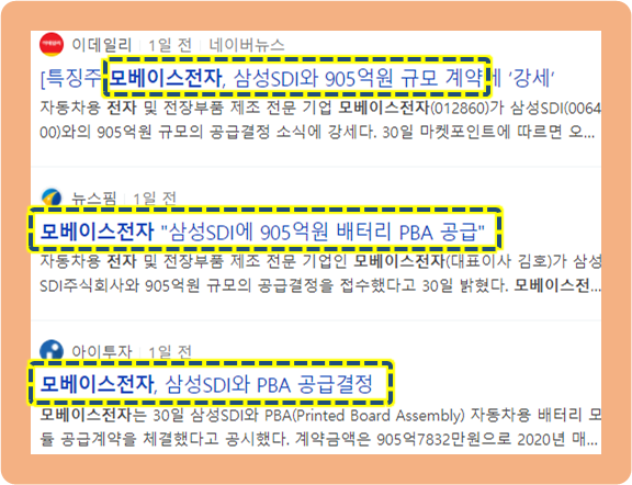그리고 2021년 3월 30일, 모베이스전자가 삼성SDI와 905억원 규모의 공급 계약을 체결했다고 발표되었습니다. 이번 계약을 통해 2027년도 12월 말까지 PBA를 공급하기로 하게 된 계약이구요. 여기서 PBA란 하이브리드와 전기차에 사용되는 자동차 배터리모듈의 부품입니다.