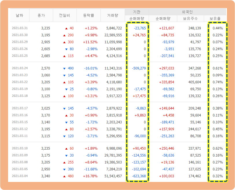 우선 기관투자자의 매매 동향을 보시면, 매도세가 매수세보다 훨씬 강한 모습을 볼 수 있구요.
