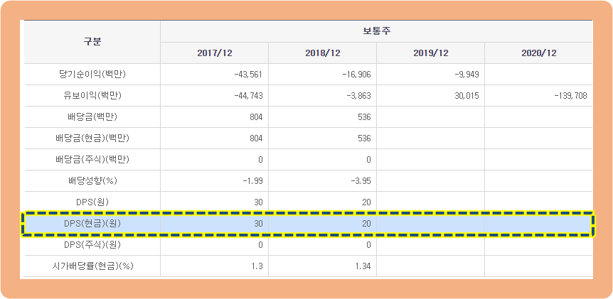 2017년도 : 30원, 2018년도 20원의 배당금을 지급했으며 시가배당률은 약 1.3%였네요.