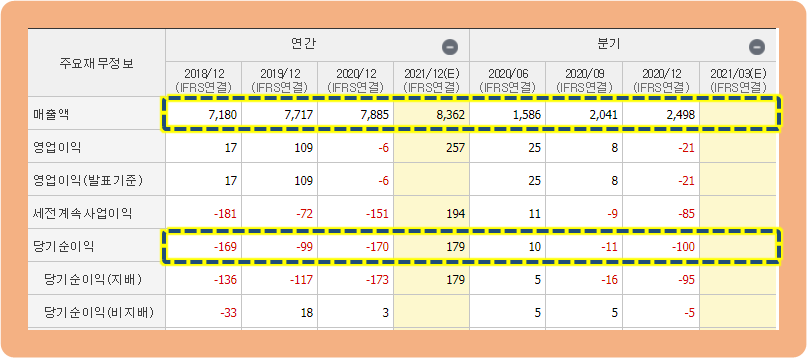 그리고 당기순이익을 보시면, 2018년 -169억원, 2019년 -99억원, 2020년 -170억원을 기록하면서 계속해서 순손실이 발생하고 있는 상황입니다. 그래도 다행히도 2021년도에는 당기순이익이 흑자 전환을 해줄 것으로 전망되는데, 일단 향후 추이를 지켜봐야될 것 같습니다.