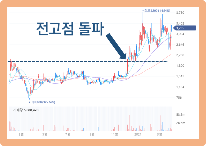 그리고 주가는 반응을 하긴 했지만, 코로나 전의 전고점까지는 회복을 하지 못한 상태로 횡보가 지속되었죠. 그러던 중 2020년 12월 초부터 주가가 갑자기 급등하기 시작하더니 2021년 1월 14일에는 최고 3,790원까지 기록했습니다.