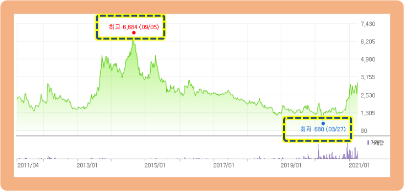 최고점은 2014년 9월에 기록한 6,684원이구요. 최저점은 2020년 3월에 기록한 680원입니다.