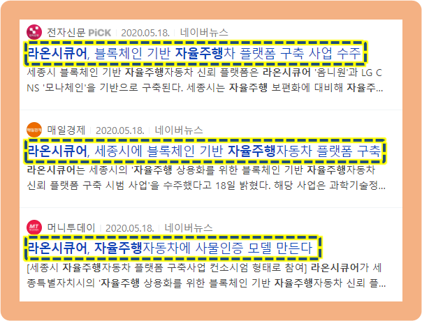 2020년 5월 18일, 라온시큐어가 세종시의 블록체인 기반 자율주행자동차 플랫폼 구축 사업을 수주했다고 발표했습니다. 이 사업은 과학기술정보통신부와 한국인터넷진흥원이 주관하는 2020년 블록체인 공공선도 사업의 일환인데요.