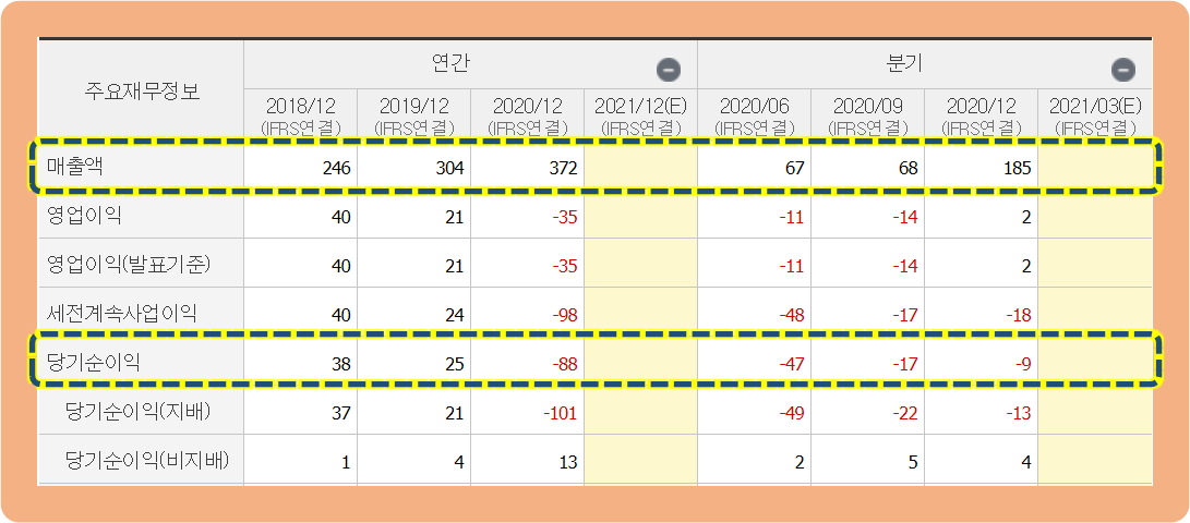 그리고 당기순이익을 보시면, 2018년도와 2019년도에는 20~30억원대로 흑자를 기록하고 있었는데요. 2020년 기준으로 -88억원 손실을 기록하면서 큰 폭으로 적자 전환이 된 상황입니다.