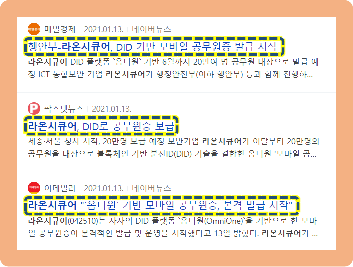 2021년 1월13일, 라온시큐어가 행안부(행정안전부) 등과 함께 진행하는 DID(분산신원증명) 기반의 모바일 공무원증 발급을 시작한다고 발표했습니다. 2021년 6월까지 정부세종청사와 서울청사, 중앙부처 소속기관 등에 속해있는 총 20만여 명의 공무원을 대상으로 발급을 확대할 계획이라고 하네요.