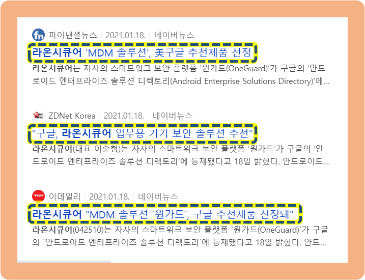 2021년 1월 18일에는 라온시큐어의 스마트워크 보안 플랫폼인 "원가드"가 구글 안드로이드 엔터프라이즈 솔루션 디렉토리에 선정되었다고 발표되었는데요. 이는 국내 모바일 단말 관리(MDM) 솔루션 중 최초로 선정된 것입니다.