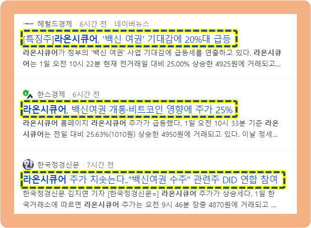 이와 관련해서 정부가 추진하고 있는 블록체인 기반의 백신여권을 SK텔레콤이 주도해서 개발할 것이라는 소식이 발표된 적이 있었구요. 라온시큐어는 백신 여권 프로젝트에 SKT가 참여했었던 DID 컨소시엄이 우선협상 대상자로 선정된 적이 있었죠. 그에 따른 수혜를 받아 이 날 주가가 급등했습니다.