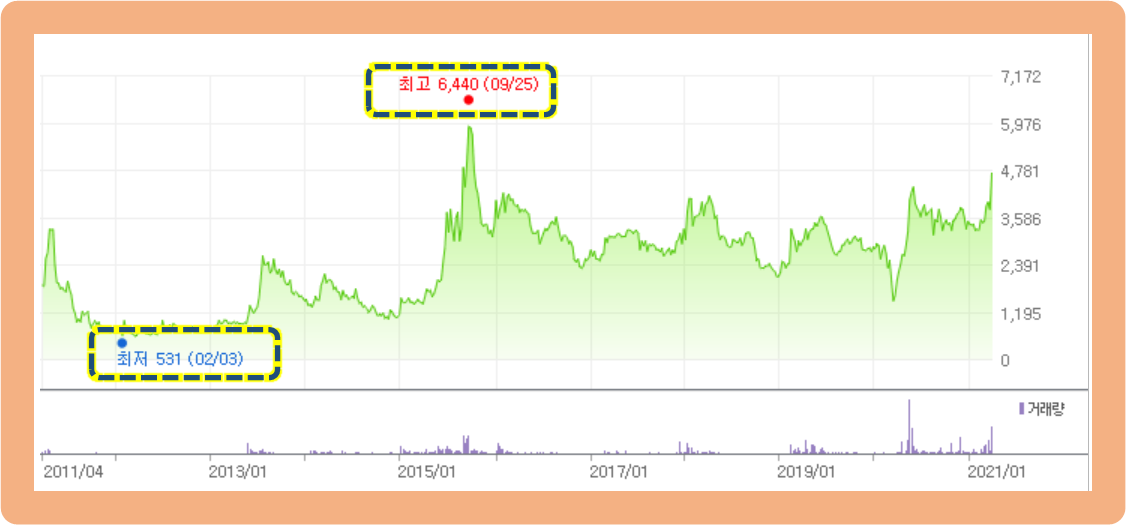 과거 10년 동안 라온시큐어의 주가 추이를 보도록 하겠습니다. 10년 간 최저점은 2011년 2월에 기록한 531원이였으며, 최고점은 2015년 9월에 기록한 6,440원이였네요.