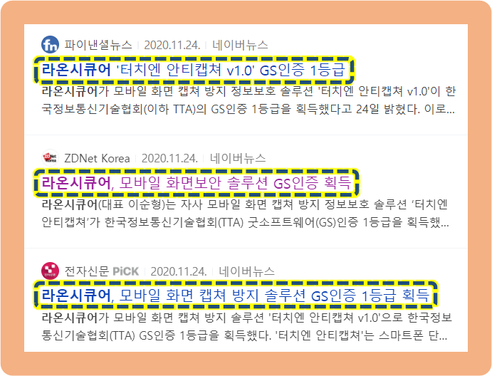 라온시큐어가 보유한 모바일 화면 캡쳐 방지 솔루션인 "터치엔 안티캡쳐"가 한국정보통신기술협회 GS(굿소프트웨어)인증 1등급을 획득했다고 합니다.
