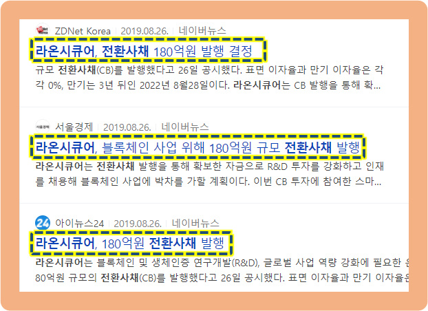 이 소식은 약 1년 반 전 소식인데요. 2019년 8월 26일 라온시큐어는 블록체인, 생체인증 R&D, 글로벌 사업 역량 강화를 시키기 위한 운영 자금을 확보하기 위해서 약 180억원 규모 전환사채를 발행했다는 공시를 발표했습니다.