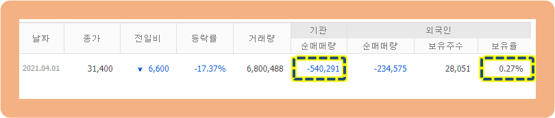 기관은 -54,291주로 매도세가 매수세보다 강한 모습을 보였구요.
