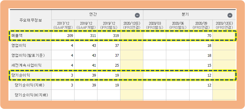 그리고 2020년 3분기 기준으로는, 매출액 70억원과 순이익 12억원을 기록하고 있습니다.