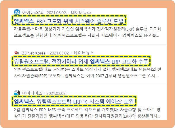 2021년 3월 2일, 엠씨넥스의 ERP(전사적자원관리) 솔루션의 고도화를 위해서 영림원소프트랩의 자회사인 시스웨어가 K-시스템 에이스를 구축한다고 발표했습니다. K-시스템 에이스란 산업별 표준 프로세스를 담고 있는 경영분석 모델이 결합된 ERP인데요.