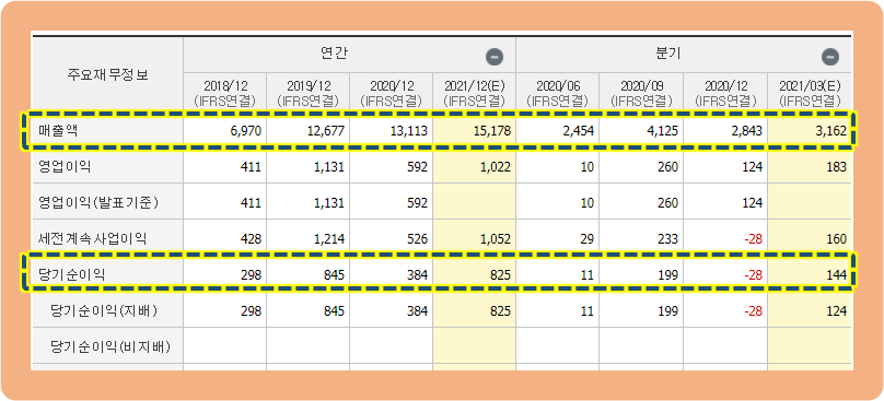 당기순이익을 보시면, 2018년도에 약 300억원에서 2019년도에 845억원을 기록하며 무려 3배 가까이 증가했는데요. 아쉽게도 2020년 기준으로는 384억원을 기록하며 다소 내려온 상황입니다. 그래도 2021년 당기순이익은 약 800억원대가 전망되는 상황이네요.
