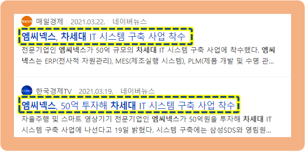 2021년 3월 19일, 엠씨넥스는 약 50억원을 투자하여 차세대 IT 시스템 구축에 착수한다고 발표했습니다. 이번 시스템 구축에는 삼성SDS, 영림원소프트랩이 참여한다고 하구요. 2020년 1분기 내 마무리 하는 것을 목표로 잡고 있다고 합니다.