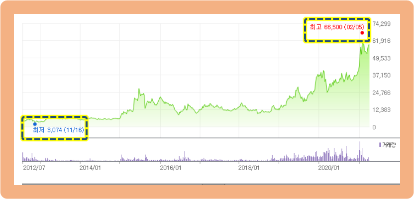 그러다가 2019년도 초반부터 주가가 서서히 상승하면서, 2021년 2월 5일에 최고점 66,500원을 터치한 상황이네요. 10년전 최저 3,074원에 비하면 무려 20배 넘게 상승한 수치입니다.