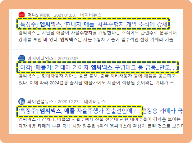 이와 같은 소식들로 인해 엠씨넥스가 자동차용 카메라 모듈 분야에서 점유율 무려 80%를 차지하는 우리나라 1위 기업라는 점이 집중되면서 수혜를 받았었습니다. 그리고 엠씨넥스는 현대차와 기아차는 물론 볼보, 지리자동차 등에 제품을 공급하고 있는 기업이구요. 이 때문에 애플카에도 제품이 적용될 것이라는 기대를 받은 것이였죠.