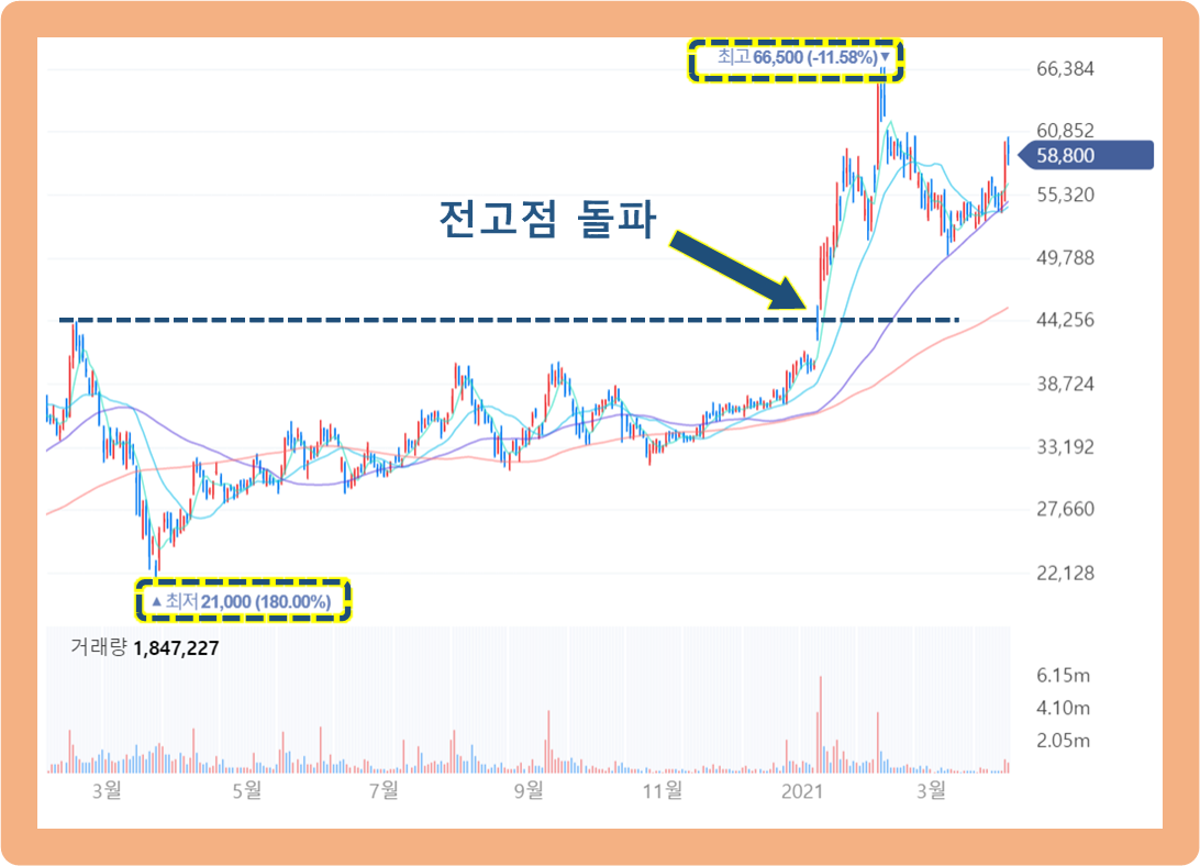 그러던 중, 2021년 1월 7일부터 주가가 갑자기 급등하기 시작했습니다. 그리고 코로나 하락 전의 전고점을 돌파해버렸고, 2021년 2월 4일에는 최고점 66,500원을 돌파했습니다.