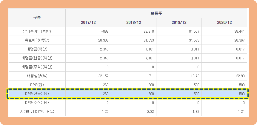 2017년 : 260원, 2018년 : 300원, 2019년 및 2020년 : 500원 배당금 지급으로, 해가 갈수록 배당금 지급액을 늘려주고 있습니다.