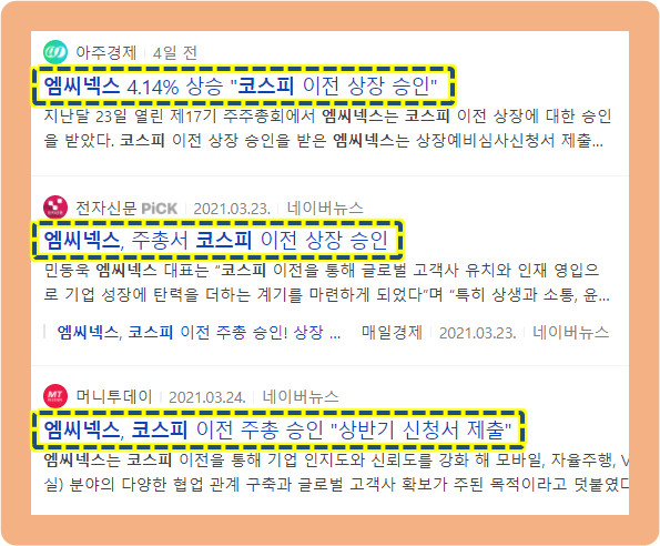 엠씨넥스는 2021년 3월 23일에 열렷던 제17기 주주총회에서 코스피 이전 상장에 대한 승인을 받은 상황인데요. 지금까지는 코스닥 종목이였지만, 이제 곧 있으면 코스피 종목이 되는 것이죠.