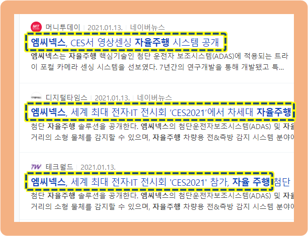 2021년 1월 13일에는 엠씨넥스가 세계적인 기술박람회인‘CES 2021에서 영상센싱 방식의 첨단 자율주행 시스템 기술을 발표했는데요.