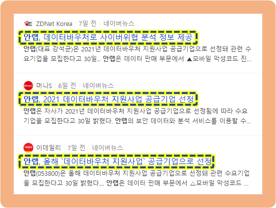 2021년 3월 3일, 안랩은 2021년도 데이터바우처 지원사업 공급기업으로 선정되었는데요. 이에 따라서 수요기업을 모집한다고 발표했습니다. 안랩의 보안 데이터 및 분석 서비스 등을 이용 가능하도록 제공해준다고 하네요.