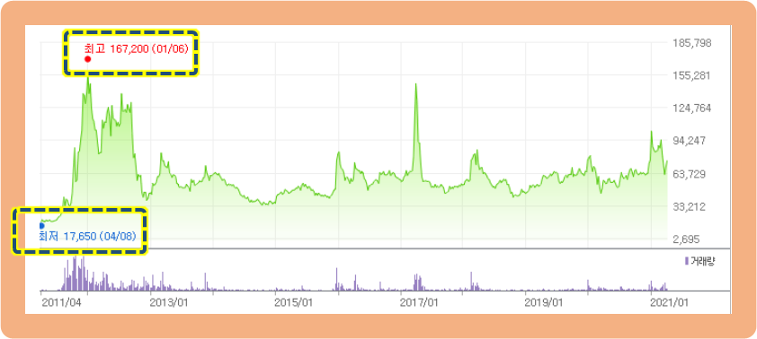 그리고 이후 2020년 12월 21일부터 주가가 급등하기 시작하더니, 2021년 1월 8일에 최고점 105,300원까지 기록했는데요. 현재는 주가가 조정을 받으면서 가격이 큰 폭으로 하락하여 약 7만원대까지 내려온 상황입니다.