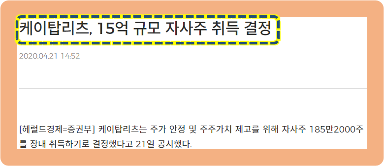 2020년 4월 21일, 케이탑리츠가 자사주 185만2,000주를 장내 취득한다고 발표했었는데요.