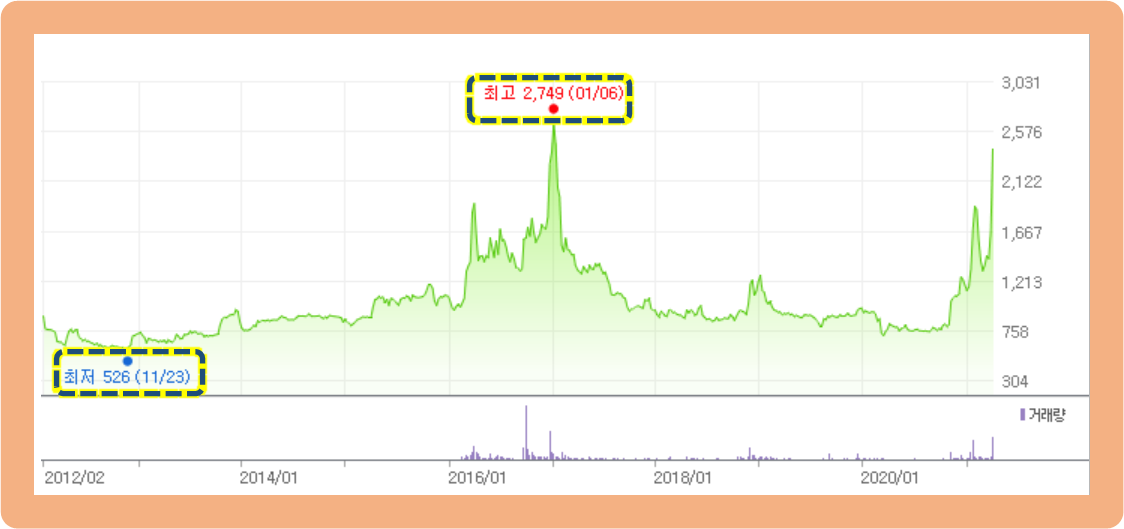 최고점은 2017년 1월에 기록한 2,749원이구요. 최저점은 2012년 11월에 기록한 526원입니다. 최고점 기록 후 주가는 계속 아래로 흐르고 있었는데, 현재 2021년 4월 9일 기준으로 2,415원까지 상승하면서 전고점까지 얼마 남지 않은 모습이네요.