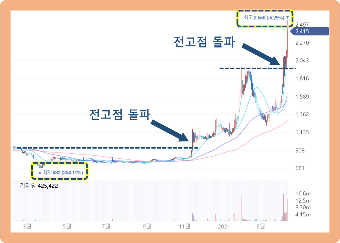 그리고 중간에 다시 주가는 조정을 받는 듯 싶었는데요. 2021년 4월 5일부터 주가가 다시 급등하기 시작하더니, 직전 전고점을 돌파해버렸습니다. 그리고 주가는 계속 치솟으면서 2021년 4월 9일 기준으로 최고점 2,550원까지 터치한 상황이네요.