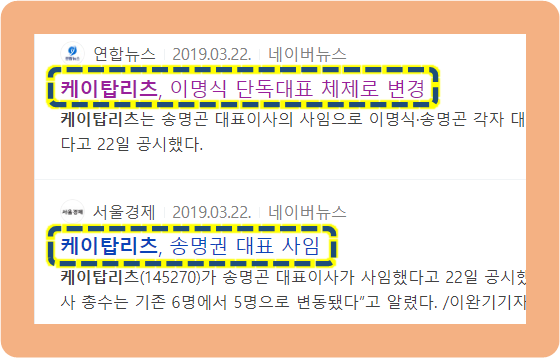 이 소식은 2019년도 3월에 발표된 내용이였는데요. 케이탑리츠는 원래 송명곤, 이명식 두 분의 각자 대표 체제로 운영이 되던 기업이였습니다.