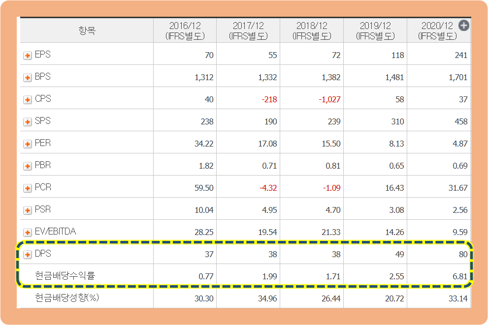 특히 2020년 기준으로 배당금을 80원 지급해주면서, 시가배당수익률이 무려 6.8%를 기록했습니다. 주식 배당수익률 치고는 매우 높은 수준인 것이죠. 앞으로도 실적 개선에 따른 배당금 증가를 기대할 수 있는 종목으로 보입니다.