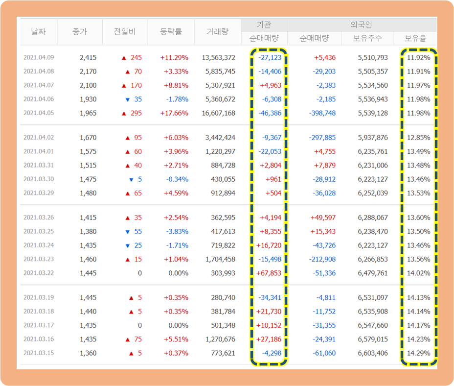 먼저 기관투자자의 경우를 보시면, 매수세와 매도세가 비슷한 수준으로 균형을 이루고 있습니다.
