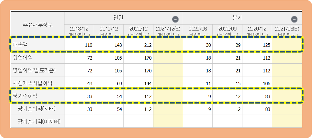 그리고 연간 당기순이익을 보시면, 2018년 : 33억원, 2019년 : 54억원, 2020년 : 112억원으로 계속해서 흑자를 기록하고 있는데요. 흑자 폭이 3년 동안 무려 3배 이상 증가했네요.
