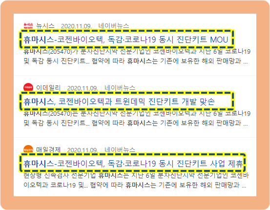 그리고 2020년 11월 9일에는 휴마시스가 분자진단시약 전문업체인 코젠바이오텍과 11월 6일 코로나및 독감 동시 진단키트 사업 협력을 위한 MOU를 체결했다고 발표했습니다.