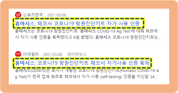 2021년 4월 6일, 코로나 확진자수가 증가하면서 휴마시스가 셀트리온과 협력하여 개발한 코로나 신속 항원진단키트가 3월 18일 식약처의 승인을 받았다는 소식이 주목을 받았습니다. 이 진단키트를 이용하면 환자의 비인강 도말 검체를 체쥐하여 약 15분만에 코로나 감염 여부를 확인할 수 있다고 하는데요.