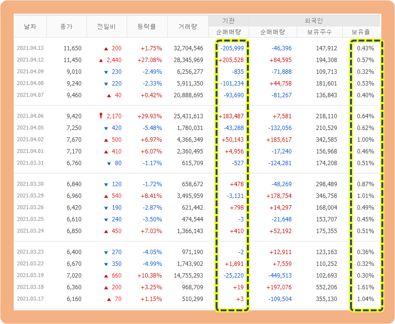 먼저 기관투자자의 경우를 보시면, 매수세가 매도세보다 약간 더 우위에 있는 것을 알 수 있습니다.