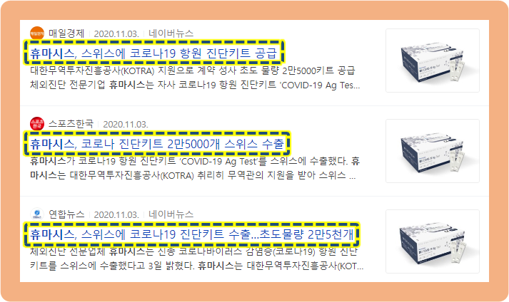 2020년 11월 3일, 휴마시스가 코로나 항원 진단키트를 스위스에 수출하게 되었다고 발표했습니다.