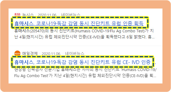 그리고 3일 뒤인 2020년 11월 6일에는 코로나와 독감 바이러스의 항원을 동시에 진단할 수 있는 항원 신속진단키트인 "휴마시스 COVID-19/ Flu Ag Combo Test"가 유럽 체외진단시약 인증을 획득했습니다.