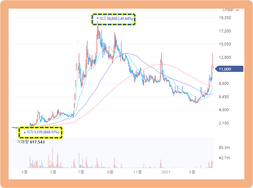 최저점은 2020년 3월 1,170원이고 최고점은 2020년 8월에 기록한 18,850원인데요. 무려 16배 가량 증가한 것이죠. 하지만, 최고점을 터치한 후 큰 폭으로 등락을 반복하면서 주가는 하락했습니다.